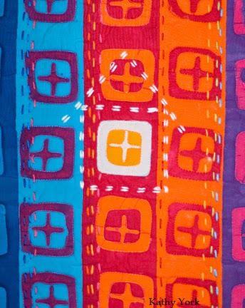 On the next photo you can see many layers of color built up and the last layer of dye the browns and blacks. They only go on a few sections of the quilt, so those areas have been protected with a line of wax drawn precisely around them. After the darker dyes are added, they make the bright colors from underneath really pop with the contrast.