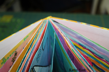 This took more time. I had to cut the strips of paper, fold them, punch holes and sew to each individual page. Then there was some time involved in sewing the signatures together. It was all easy though. This technique had the advantage of the pages opening flat, and you could see all the art, with the exception of the 1/4 inch covered by the white folded strip for the binding. I also added a hard back cover with the Mistyfused fabric on the outside.